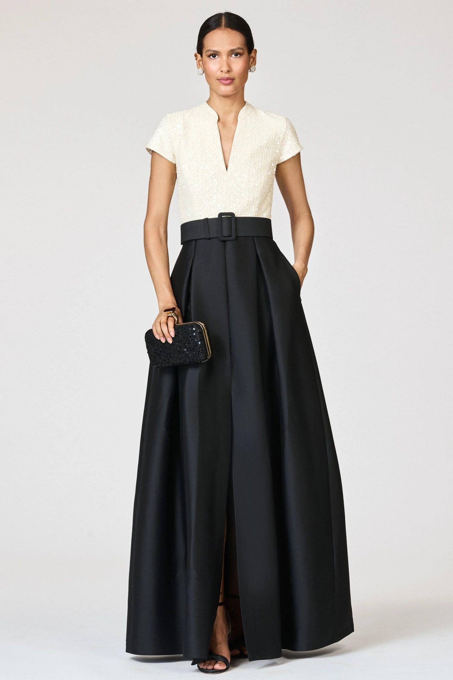 The Arden Gown in Moonlight/Black is an elegant study in modern contrasts and tailored sophistication. The bodice, crafted in shimmering moonlight-hued sequins, features a clean V-slit neckline and cap sleeves for polished, subtle sparkle. A wide, structured belt defines the waist before releasing into a dramatic black Mikado skirt with deep box pleats and hidden pockets, creating graceful volume with architectural precision. Effortlessly striking and timelessly chic, Arden is designed for evenings that demand refined glamour and artful detail.