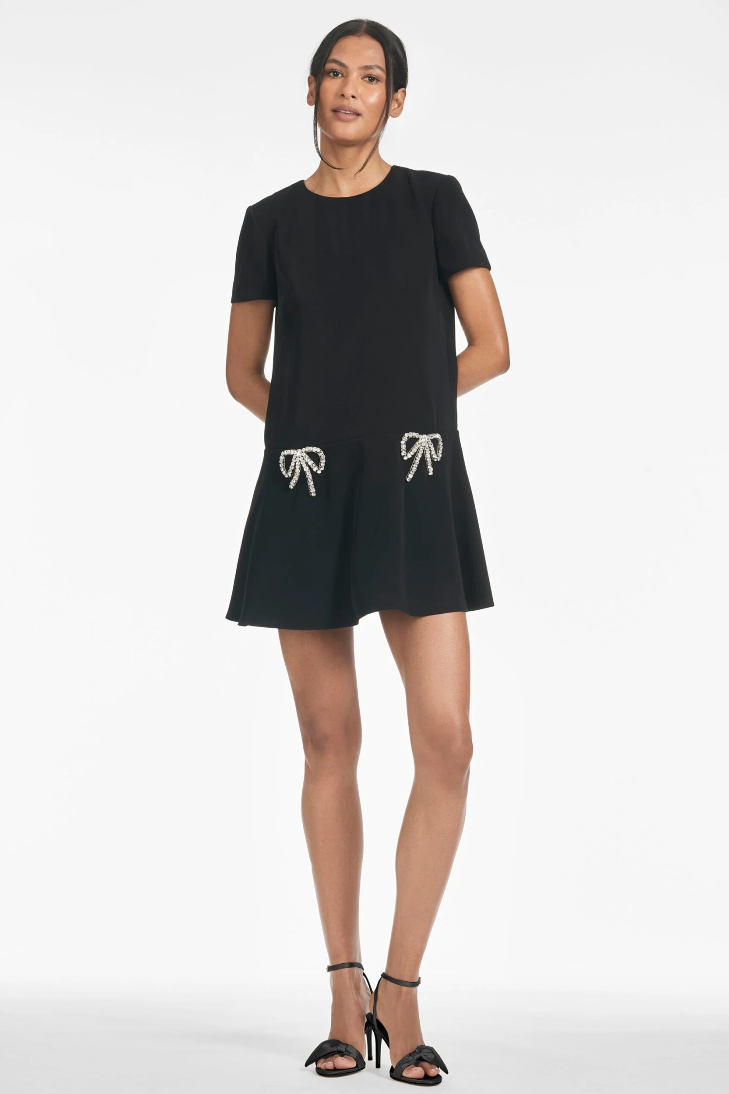 Elegance meets darling with the Bethany dress in luxe black stretch crepe. This LBD features two crystal bows that add just the right touch of sweetness. Oh, did we mention she has pockets? This is the forever piece you’ll reach for time and time again.Â