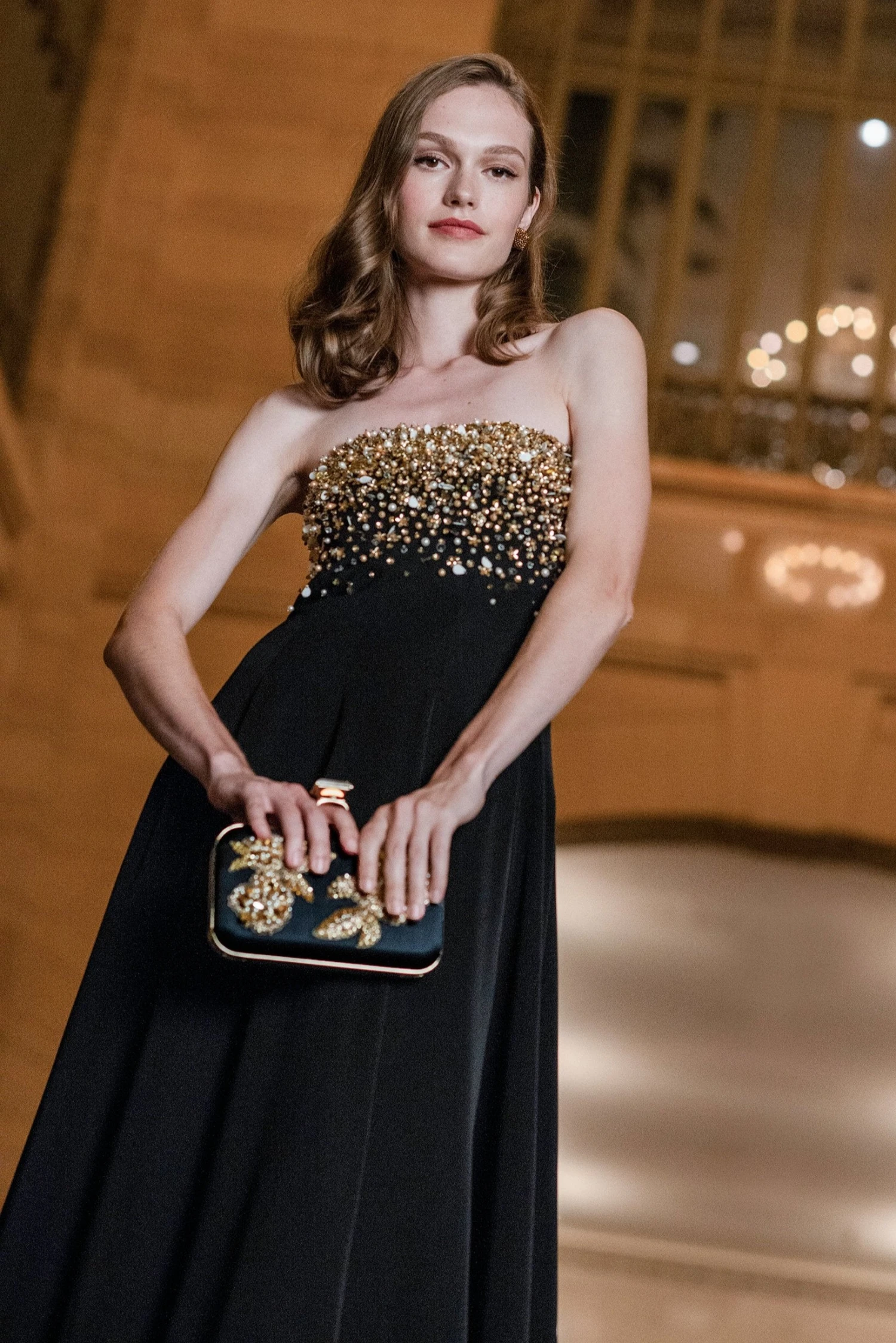 Bettany is a special case of classic meets statement. She’s a full-length, black strapless gown with our signature touch of glamour. The bodice features gleaming gold embellishment that catches the light in all the right ways, cascading down in the most elegant, ethereal way. Prepare to turn heads with this piece.