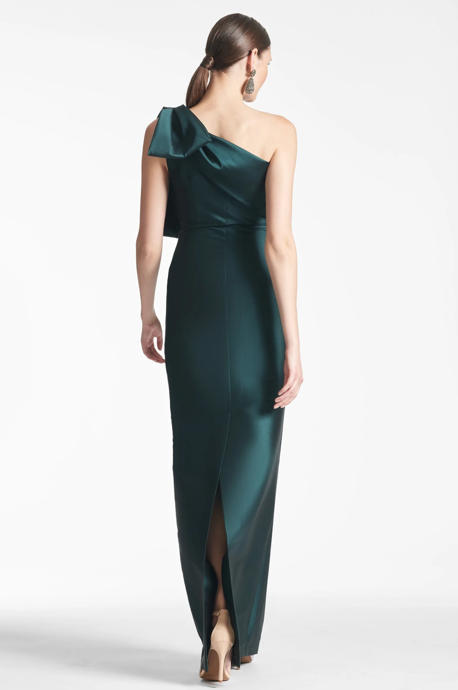The Bonnie column dress is a sleek sleeve of double-face stretch Mikado. Princess seams give this gown its shape at the bust and waist. An asymmetric neckline features elegant hand stitched bow that kisses the shoulder and then falls to a dramatic sash at front.Â