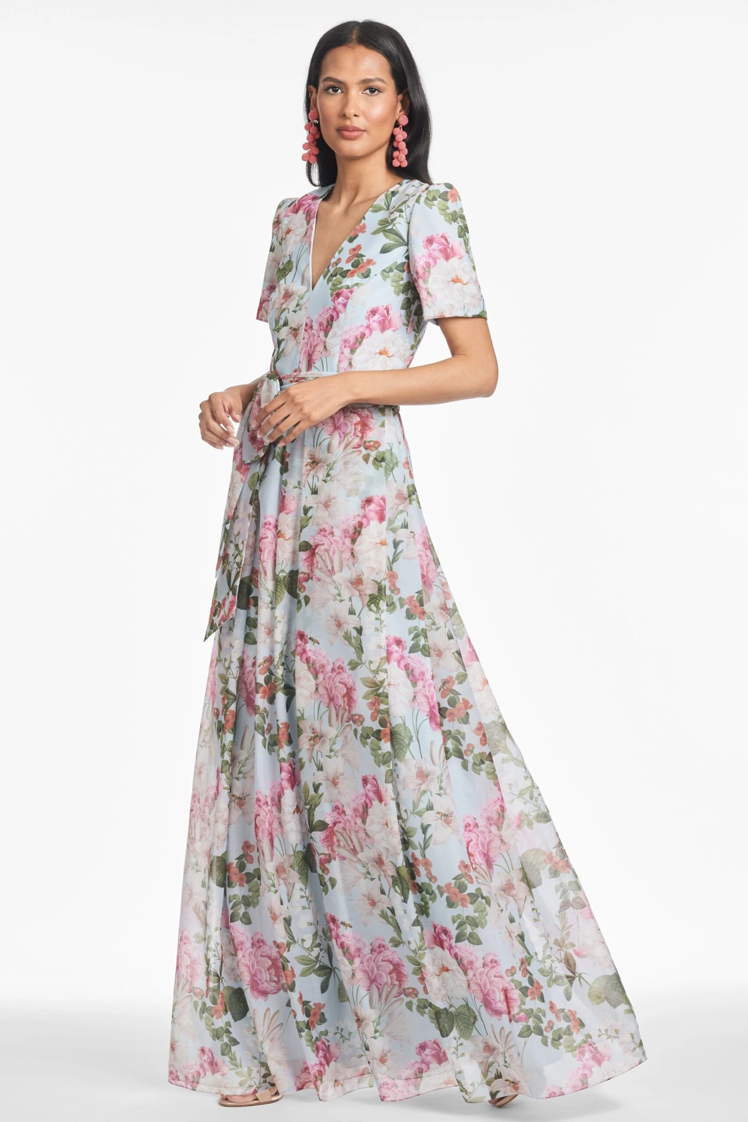 Bronwyn speaks to a timeless femininity, elegance, and grace. This sweeping organza gown showcases a form-fitting bodice, delicate short sleeve, and a pleated attached belt with a beautifully executed fixed bow at the waist.