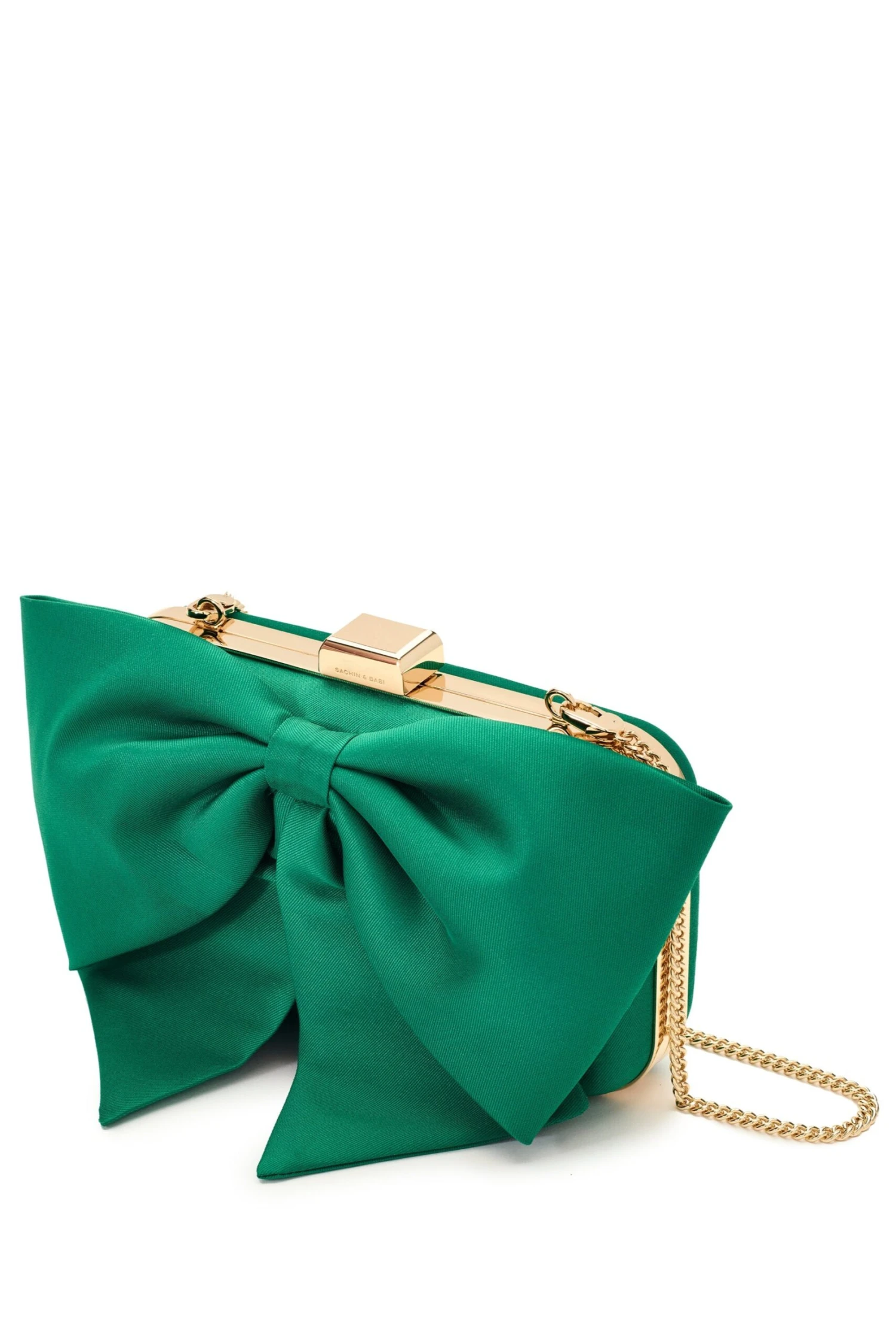 Prepare to fall in love with the Cupid’s Clutch – our clever way of avoiding “the bow” in the room. A fully framed convertible clutch with a gold finish, an interior pocket, and a removable chain with a top closure, she is sure to make an entrance. Its statement bow detailing combined with its green garnet duchess satin makes this clutch a perfect choice for your next night out.