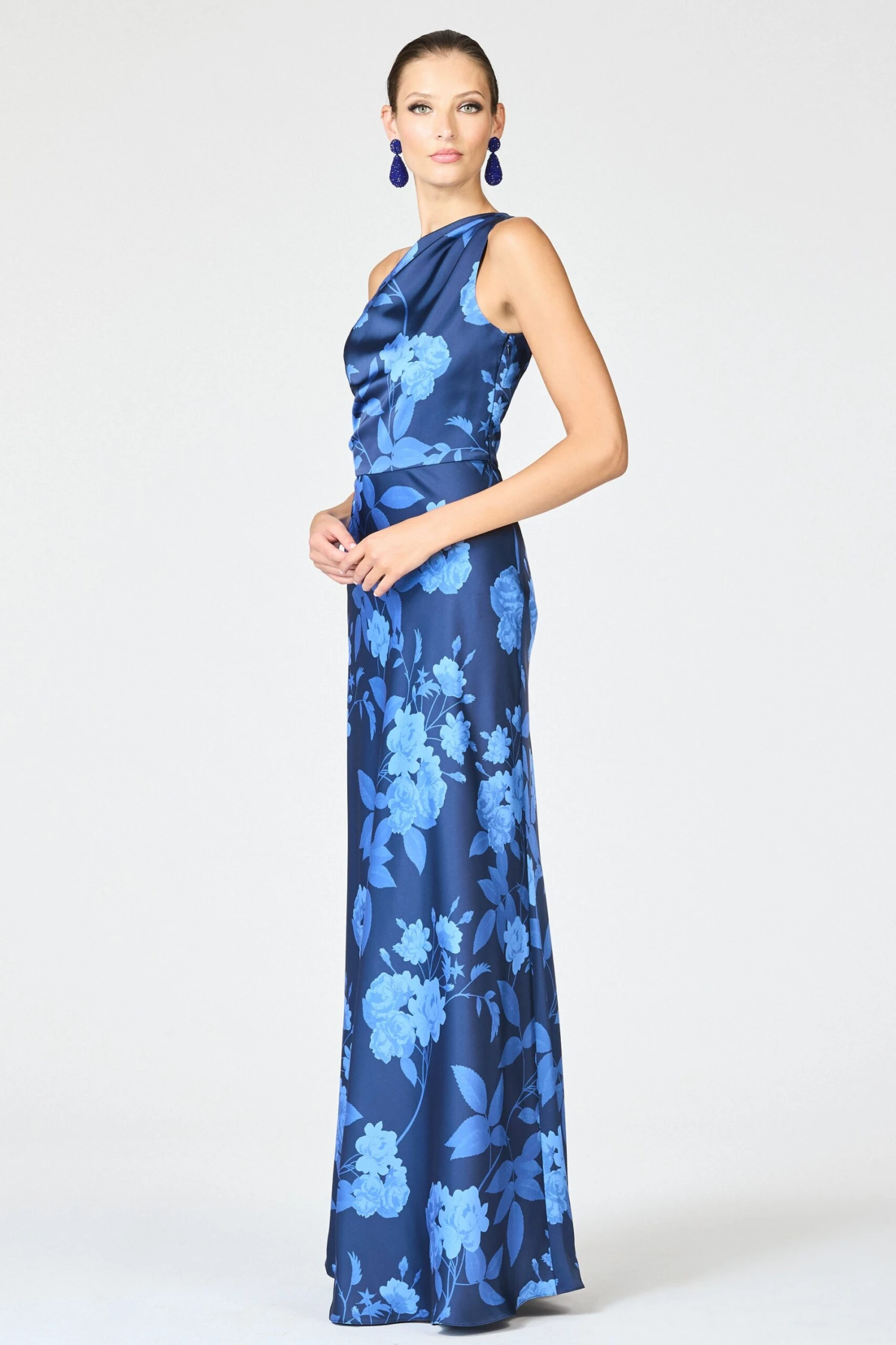 Delphine is our take on the one-shoulder, wear-on-repeat gown. The printed satin crepe cutie, featured in our Galaxy Roses print, flatters in all the right places. A sash adorns the shoulder to add visual intrigue. Timeless yet modern, this gown will be on your black tie rotation.