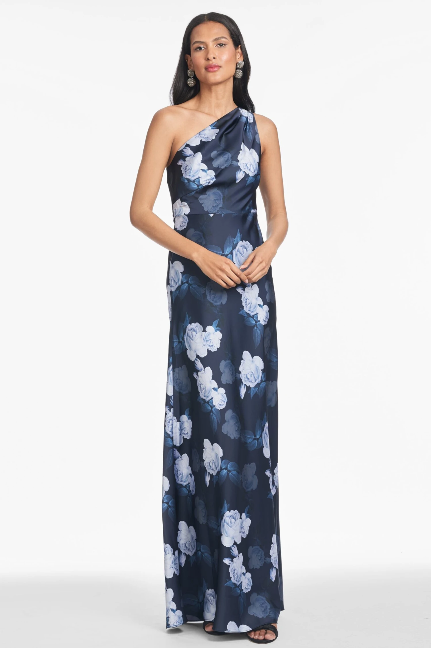 Delphine is our take on the one-shoulder, wear-on-repeat gown. The printed satin crepe cutie, featured in our Midnight Glacial Rose print, flatters in all the right places. Timeless yet modern, this gown will be on your black tie rotation.