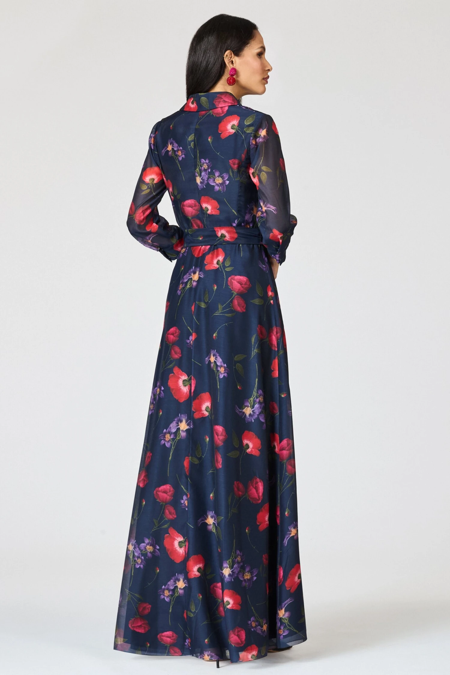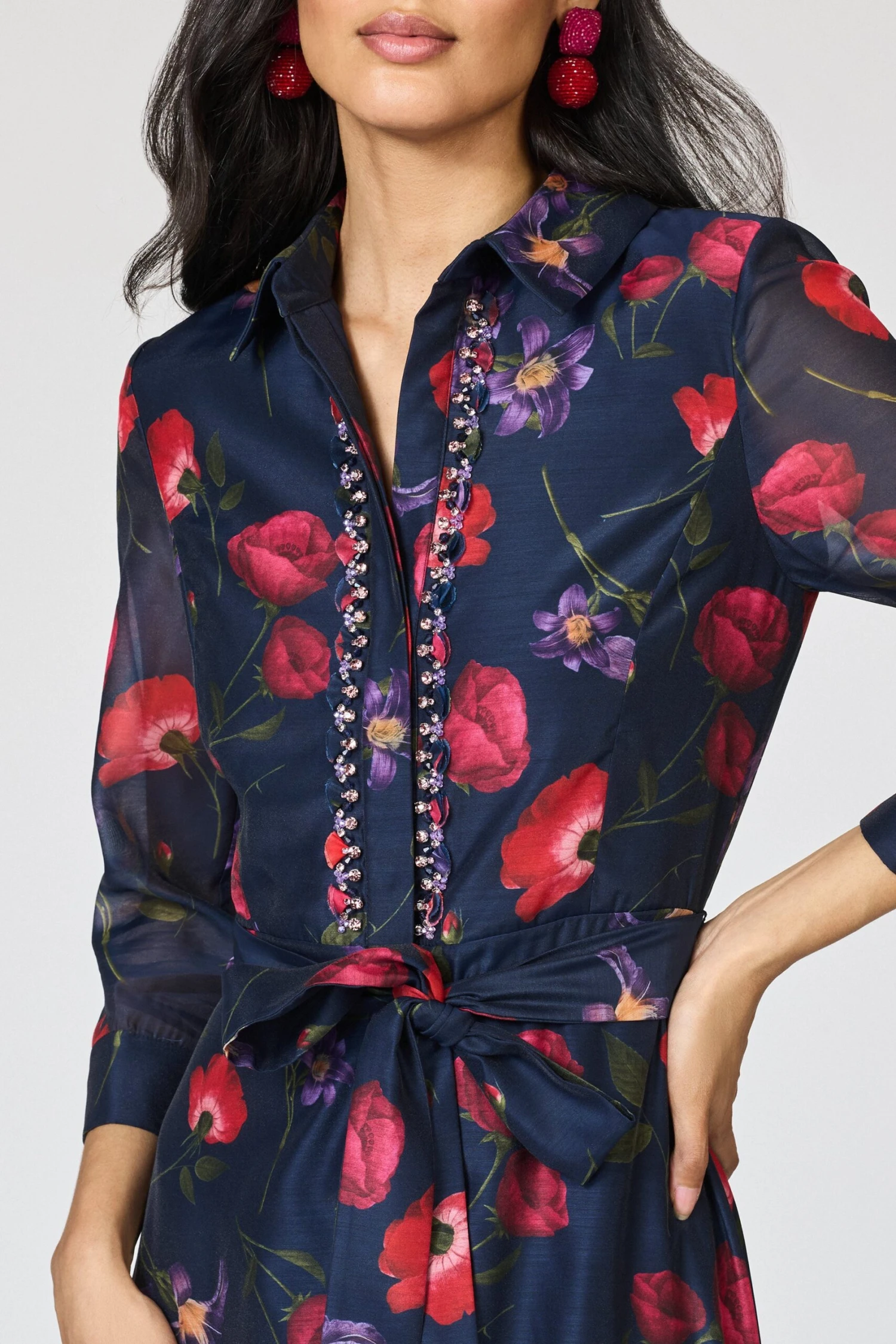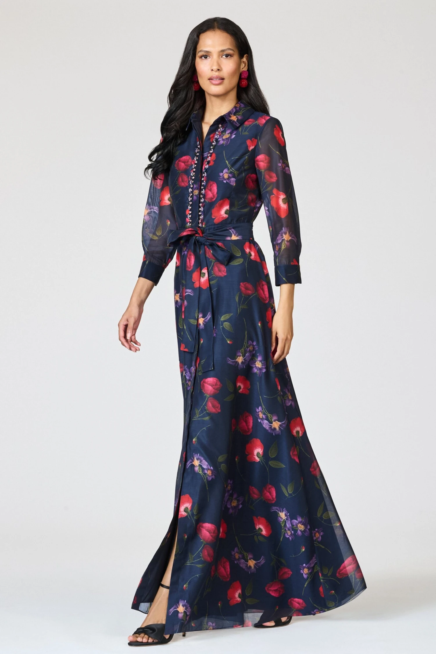 The Addison Gown in Midnight Jardin is where tailored sophistication meets feminine charm. Its three-quarter sleeves, summary-down front, and delicate embellishments create a polished look, while soft pleating adds a graceful flow. This shirt-style gown is effortless yet refined, perfect for occasions that call for quiet elegance.