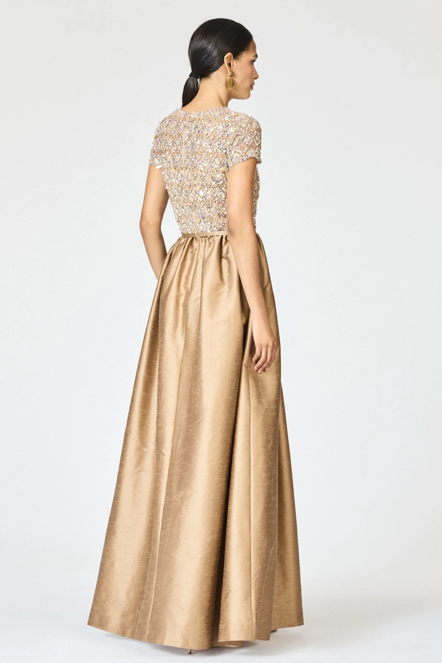 The Londa gown is a celebration of texture, light, and refined elegance. The bodice is richly hand-embellished with tonal sequins, crystals, and stones, offering a delicate shimmer that catches the light with every movement. Balanced by a voluminous skirt in structured Indian dupioni, the silhouette is both modern and timeless. The high waistline defines the figure, while the short sleeves and softly gathered skirt bring a graceful femininity. An ideal choice for formal evenings where understated glamour makes the boldest statement.