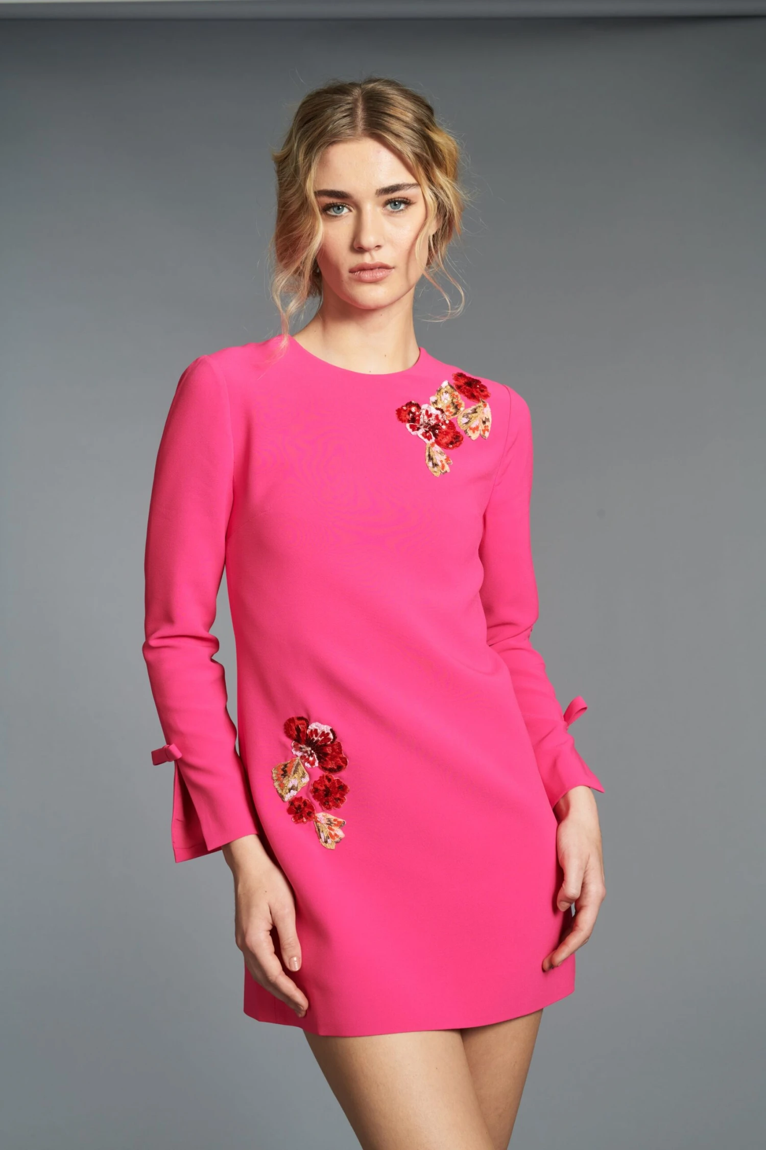 This Lily Dress in Electric Pink is designed to add an easy, stylish pop of color to any wardrobe. The hand embroidered florals make her a work of art. Crafted from a stretch crepe fabric, the mini dress is designed for comfort and all-day wear dressed up or down. Enjoy modern style with this classic piece.