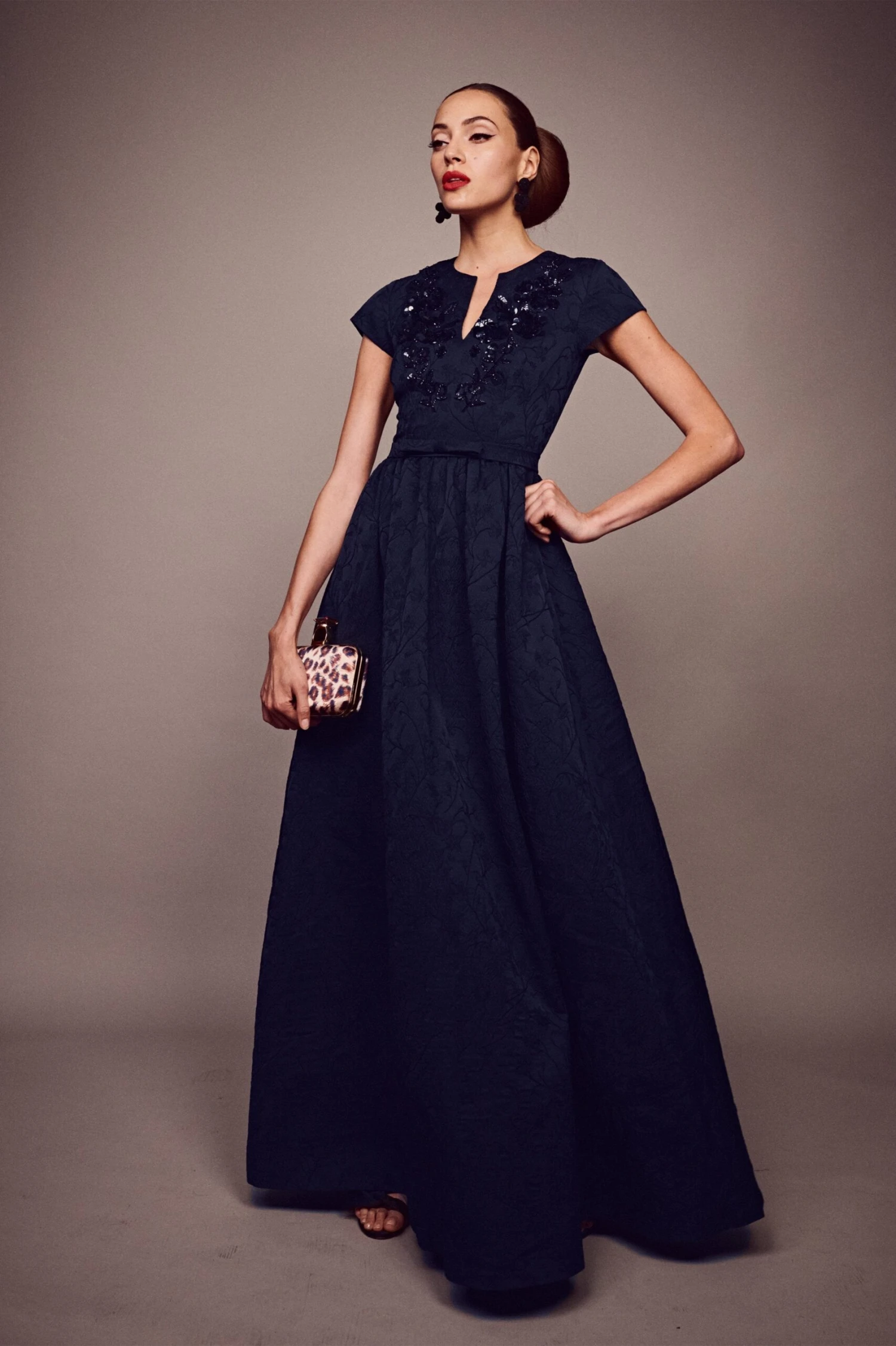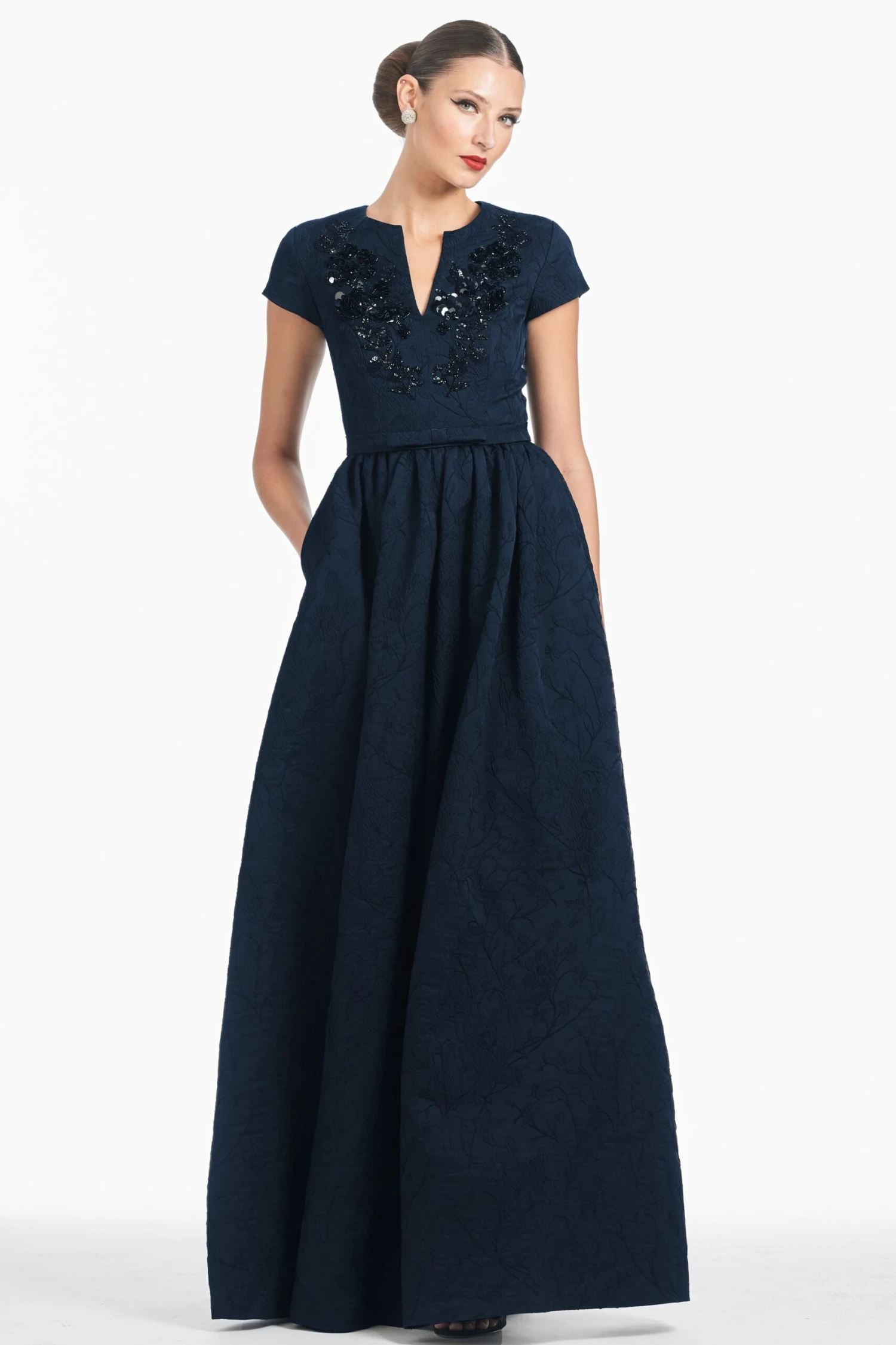 There’s more than meets the eye with Estelle. All over Jacquard Cloque comes together with cap sleeves, a slight V, and embellishment at the bodice to create a classic, forever piece. A thin belt meets in the middle and the skirt cascades into an effortless A-line. Pure elegance embodied.Â
