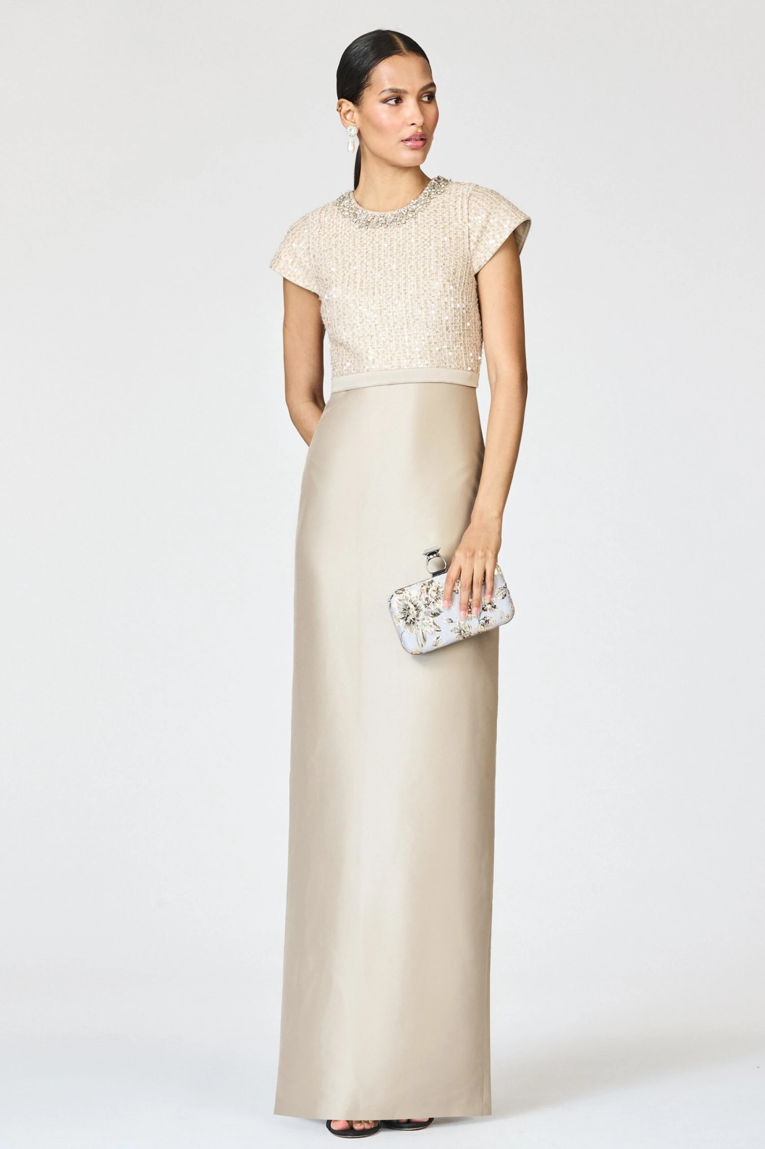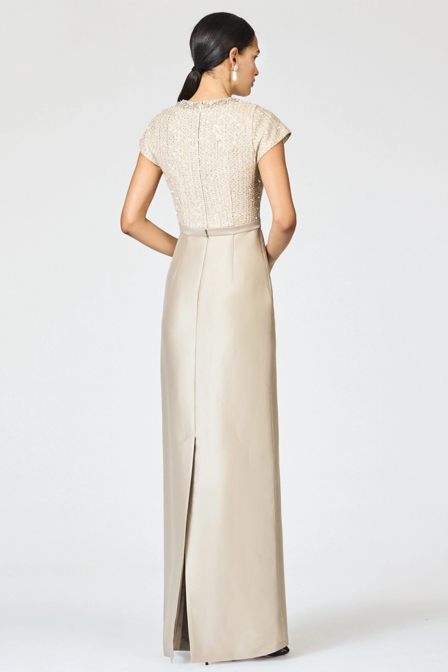 The Isla Gown in Dune/Pewter is a study in understated luxury and modern refinement. The bodice features a column silhouette paired with a cap sleeve crafted in tonal sequin tweed, catching the light with subtle, sophisticated shimmer. At the neckline, an ornate crystal-embellished collar adds an extra layer of radiance and polish. A clean Mikado skirt in Pewter drapes in a statuesque column, cinched with a coordinating waistband to define the figure. Effortlessly elegant, Isla is artfully embroidered by our 3rd generation artisans at our family-owned atelier in Mumbai.Â