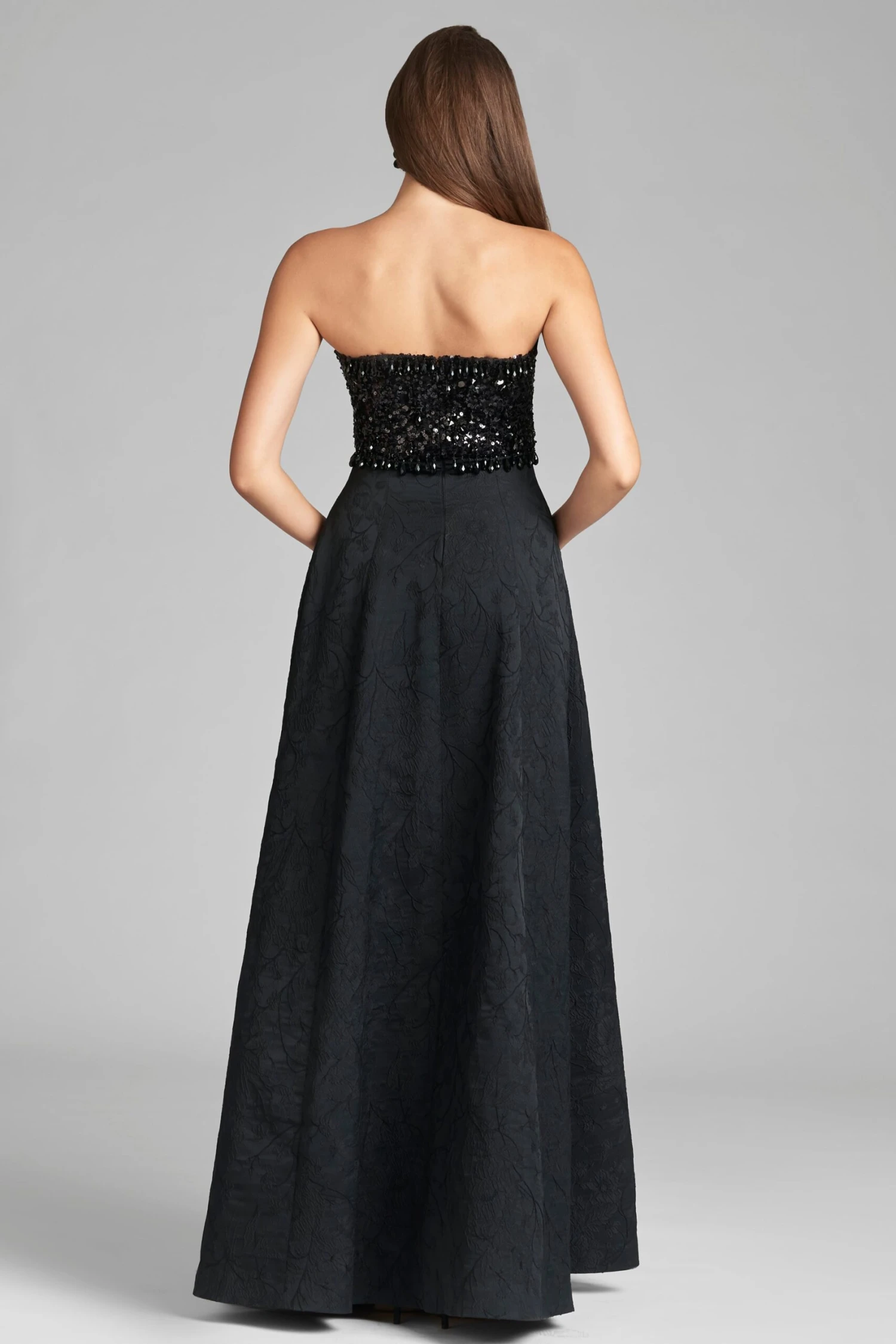 Lillian is a staple and a statement all at once. The Jacquard Cloque fabrication is exquisite on its own, but it’s made even more fabulous with the sequin and drop embellishment at the sweetheart neckline. She cascades into a subtle A-line to create the dreamiest black-tie gown.Â