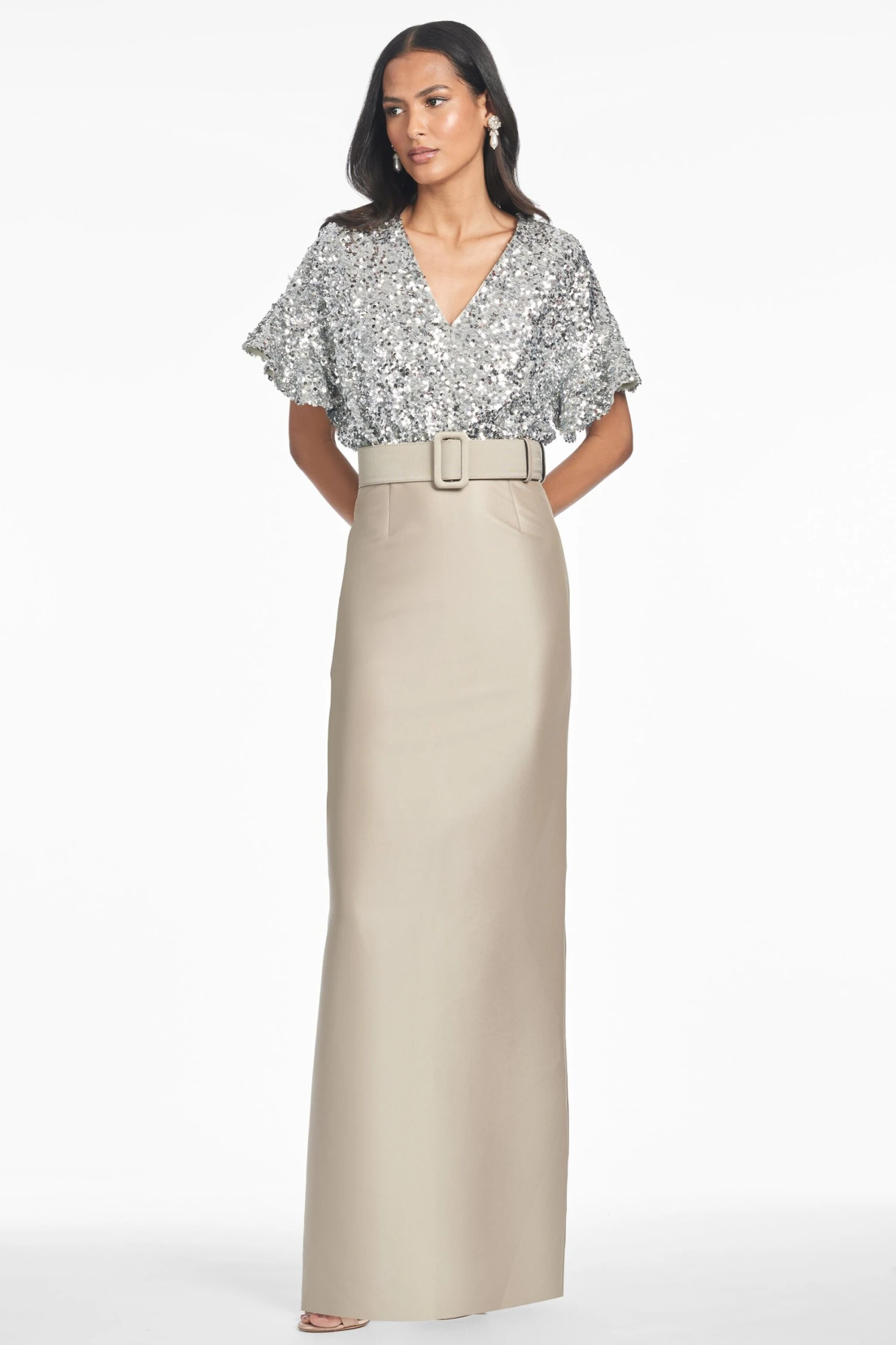 Prepare to turn heads in the Marlene. A classic column skirt in double-face Mikado meets glittering metallic stretch micro-sequins for the ultimate black-tie ensemble. The drop sleeve offers an easy elegance to this otherwise classic silhouette. A self-belt in silver pewter completes the gown.
