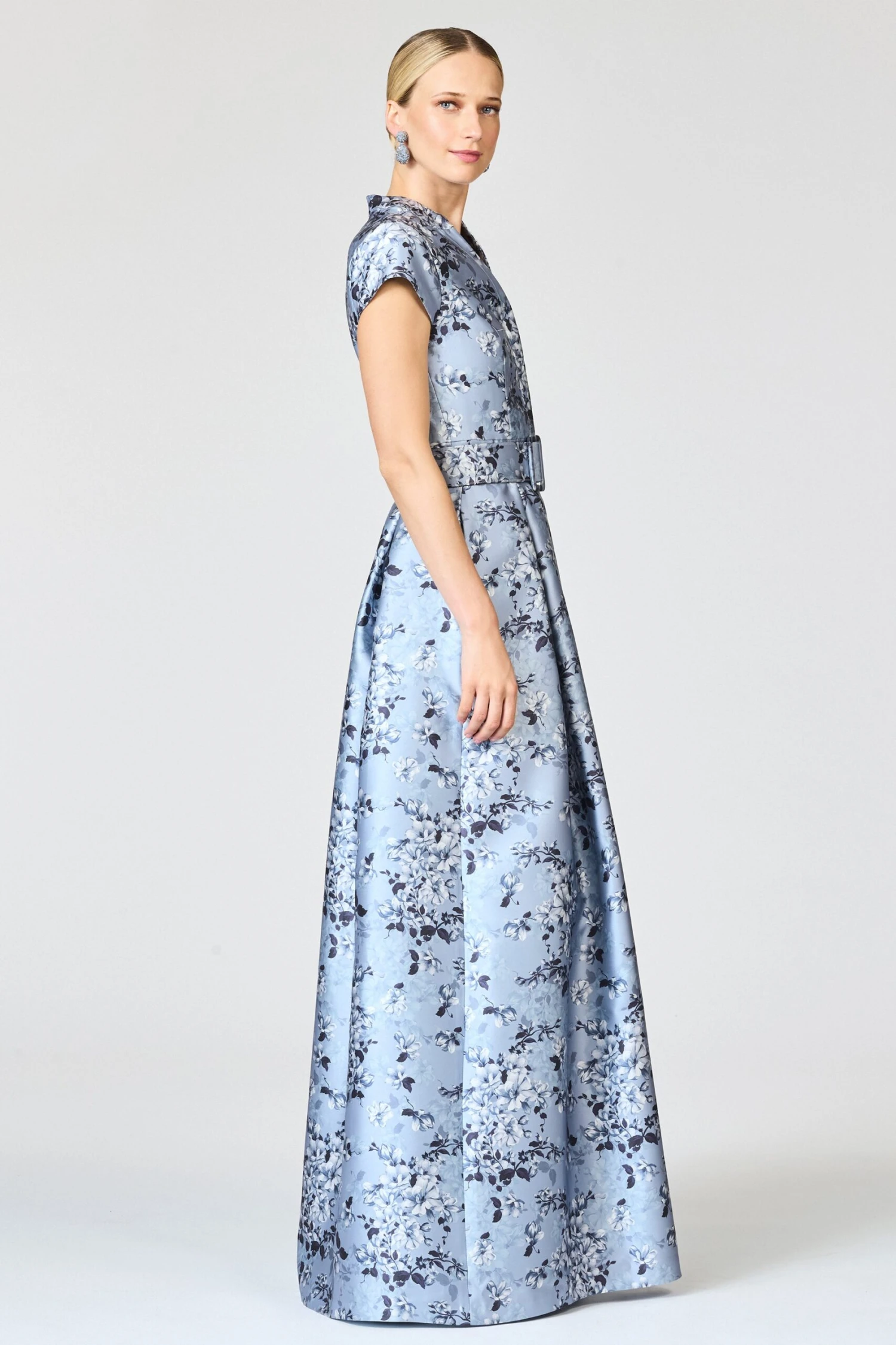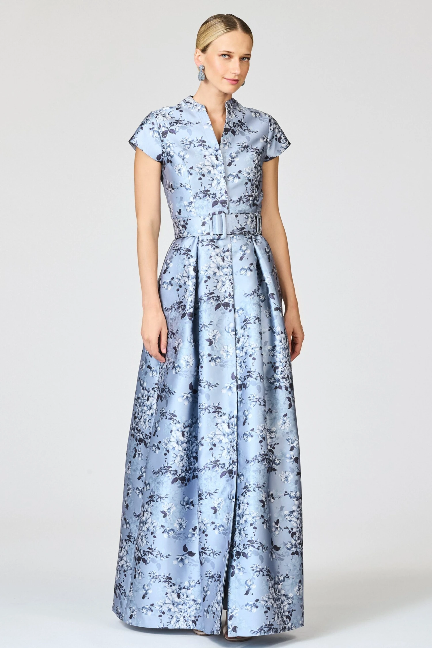 Make no mistake, the Marta Gown is no wallflower. She is the epitome of timeless, elevated personal style and quiet luxury. The fit and print are everything. The floor-length silhouette is partially inspired by the impeccable tailoring of a “shirt style” fit. This incredibly flattering body finds its way into our Iced Cherry Blossom print. A banded collar is tastefully cut away to meet concealed front summarys. Our Mikado fabric with the mono-color florals makes this dress a classic and a statement all at once.