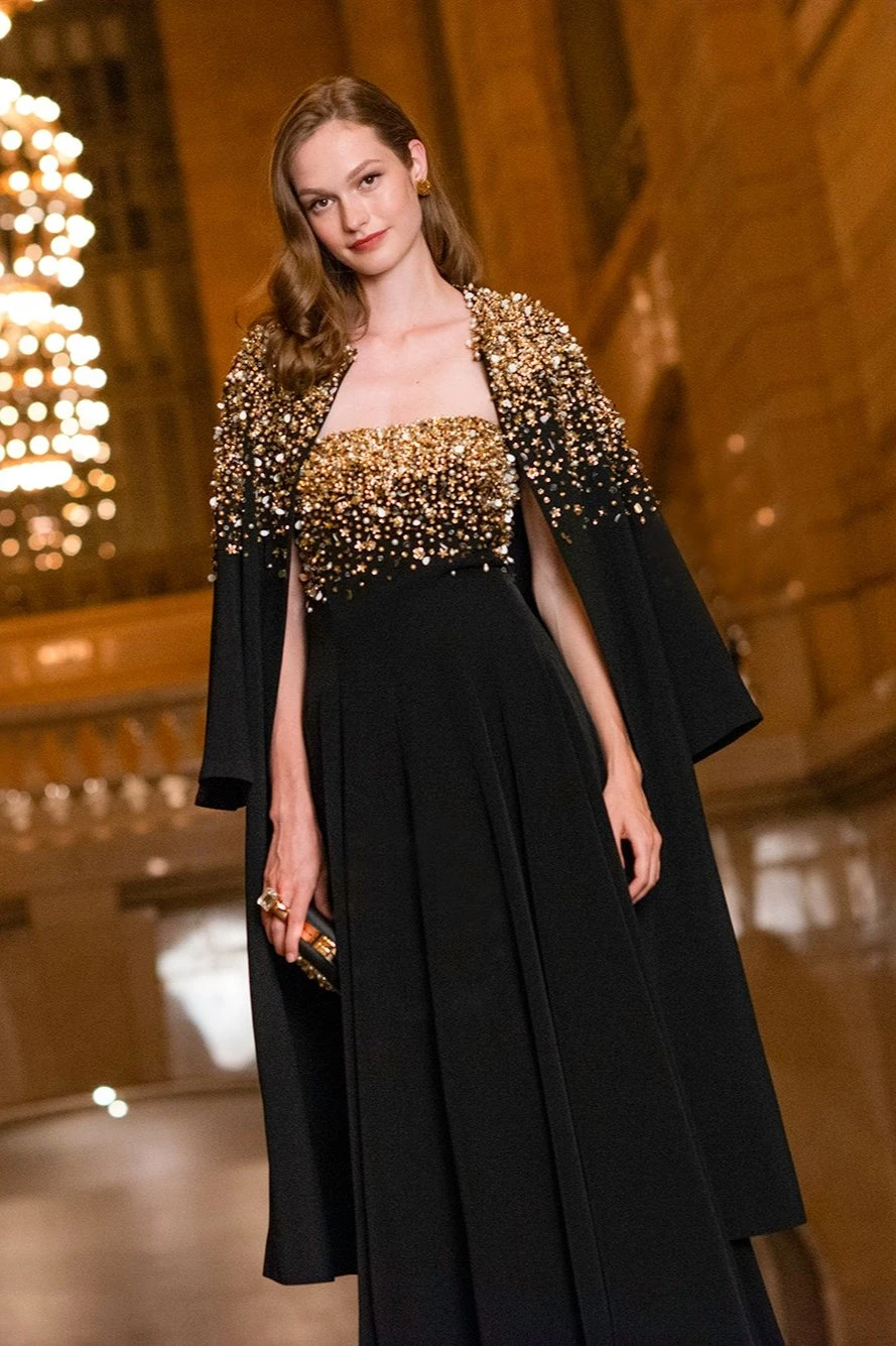 Timeless and dramatic, the Prima Coat is a grande addition to any wardrobe. The seasonless crepe fabric gives it a luxurious look with a relaxed, intentionally easy fit. Hand placed gold and pearl embellishment blanket the neckline catching the light in all the right ways. This is not for the faint-fashioned hearted; this is for all of our bold glamour girls!