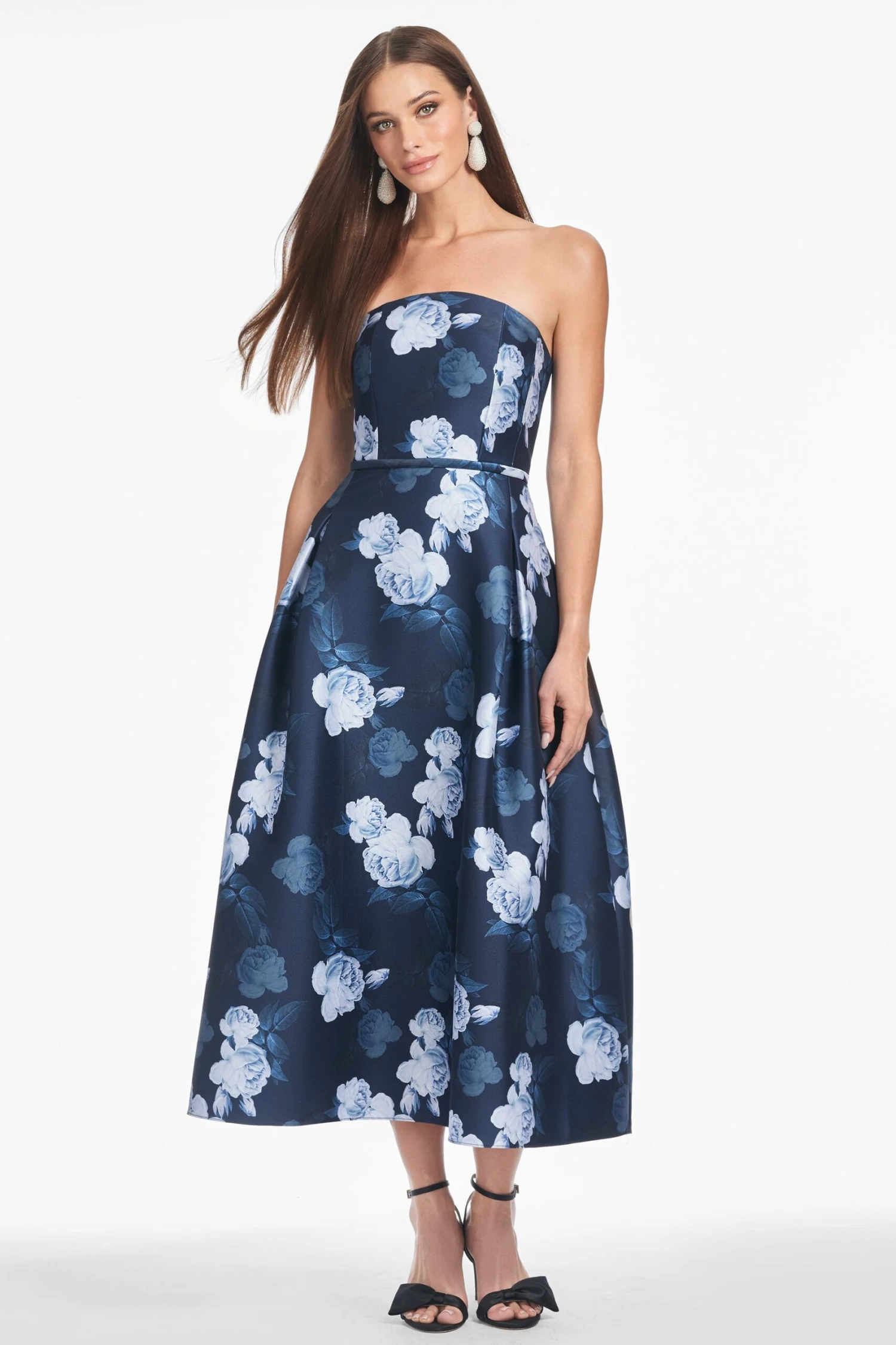 Simply put, Shay is something special. This strapless, tea-length stunner features a fitted bodice that perfectly cascades into an A-line skirt. There you’ll find our Midnight Glacial Rose print, amplifying the already elegant silhouette into a true work of art.Â