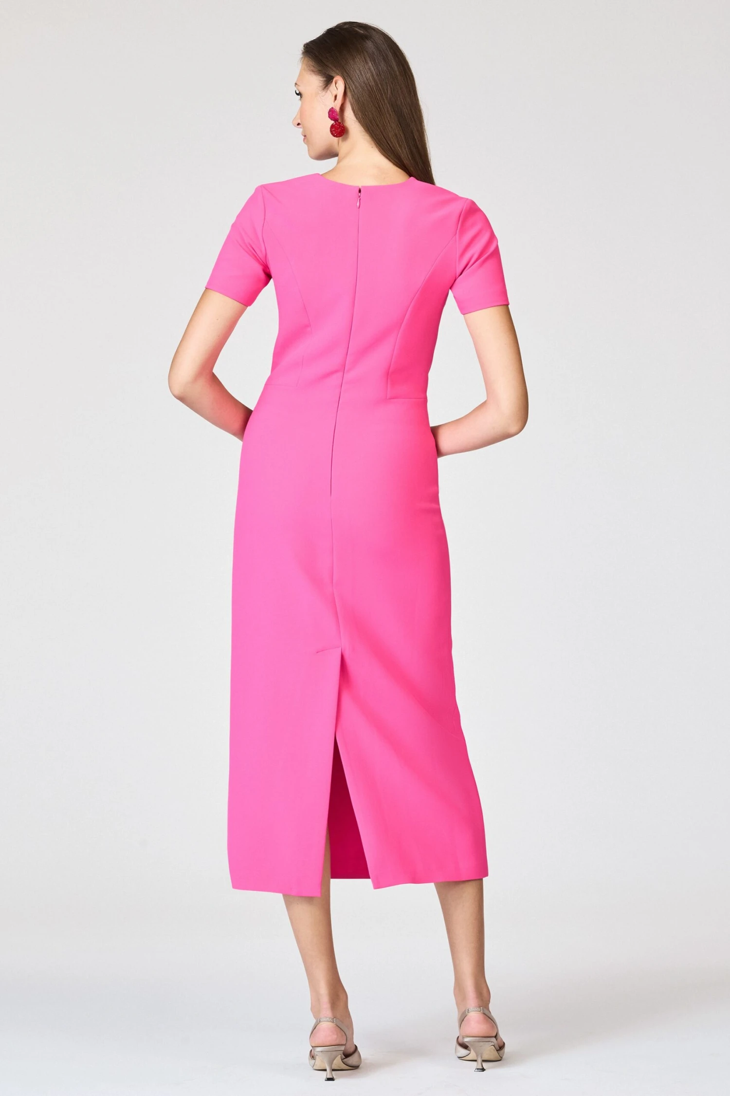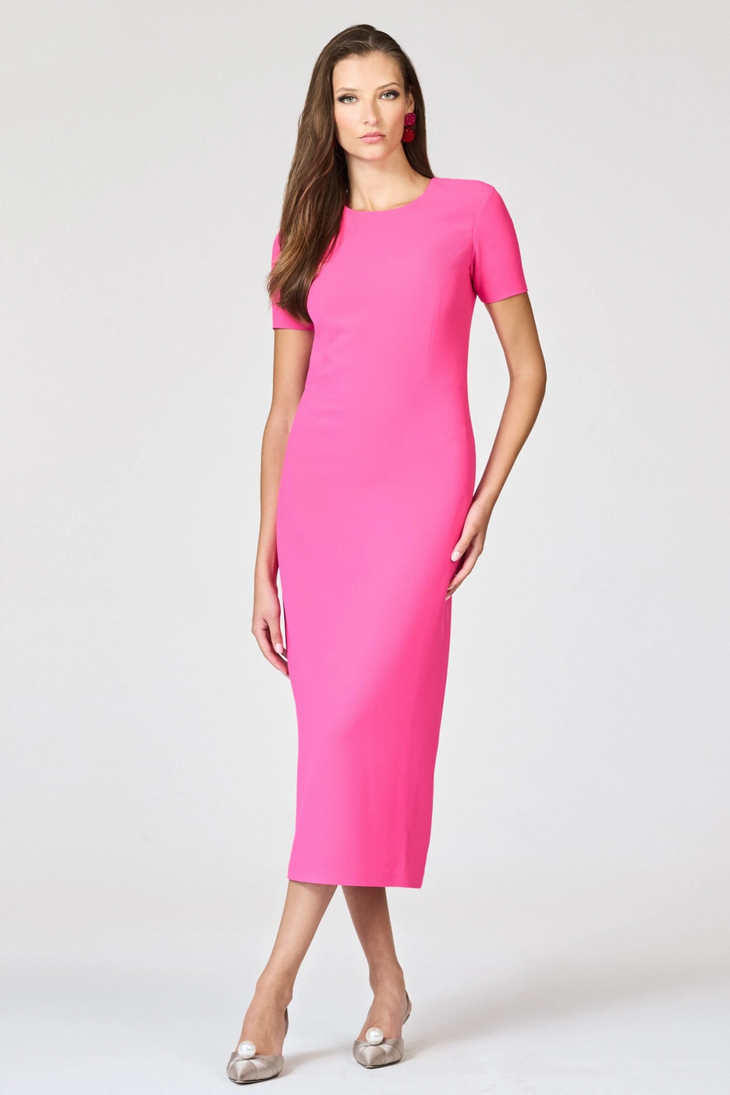 The Tamara Dress in Cerise is a modern study in bold, streamlined elegance. Crafted in a vivid pink hue that demands attention, made with thick stretch crepe fabric, this tailored midi silhouette features a clean jewel neckline and short sleeves for a polished, minimalist effect. The sleek fit skims the body with quiet confidence, while a back vent reveals an unexpected flash of embroidered detail for added intrigue. Perfect for any time of day, it can easily transition you from your desk to dinner. Effortlessly striking, Tamara is designed for occasions that call for confident color and refined sophistication.