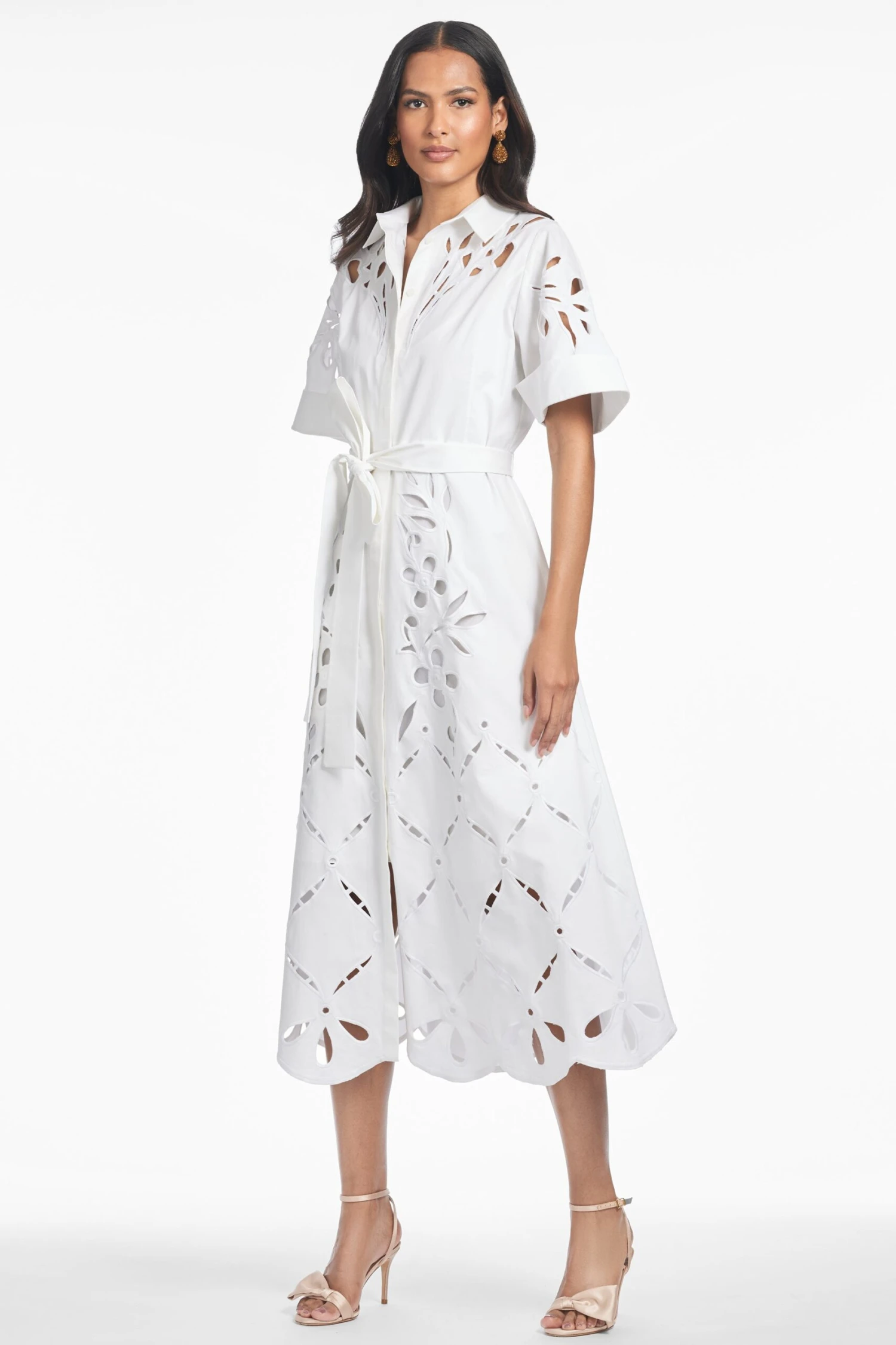 The Vincenza in White is the perfect “White Party” dress, elevated, elegant, and unique. This all-over embroidered shirt-style dress boasts modern design details to balance the classic nature of the silhouette, such as the banded, starched sleeve that holds its shape, drawing contrast to the sleek a-line cut of the dress. Our embroideries are fashioned by our 3rd generation artisans at our family-owned atelier in Mumbai.
